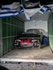 Doch daraus entstand dann schnell eine andere Idee, angestoßen von Erik Raab: da gebe es doch eigentlich noch einen schwarz-roten, umgebauten MX-5 NC in einem Container auf dem Gelände von Zelte Raab. Der stehe dort seit 2018 und habe damit auch seit 7 Jahren keinen Motor mehr, nachdem er nach einem Motorschaden abgestellt und die Reparatur angestoßen, aber nicht vollendet worden sei. Aber theoretisch mit Motor eine perfekte Basis, um in der Roadster Challenge zu starten. Man müsse sich das Auto nur mal genauer anschauen und ich mich dann natürlich entscheiden, ob ich das Projekt angehen möchte, den NC wieder einsatzbereit zu machen. Doch dazu muss er natürlich erstmal aus dem Container!